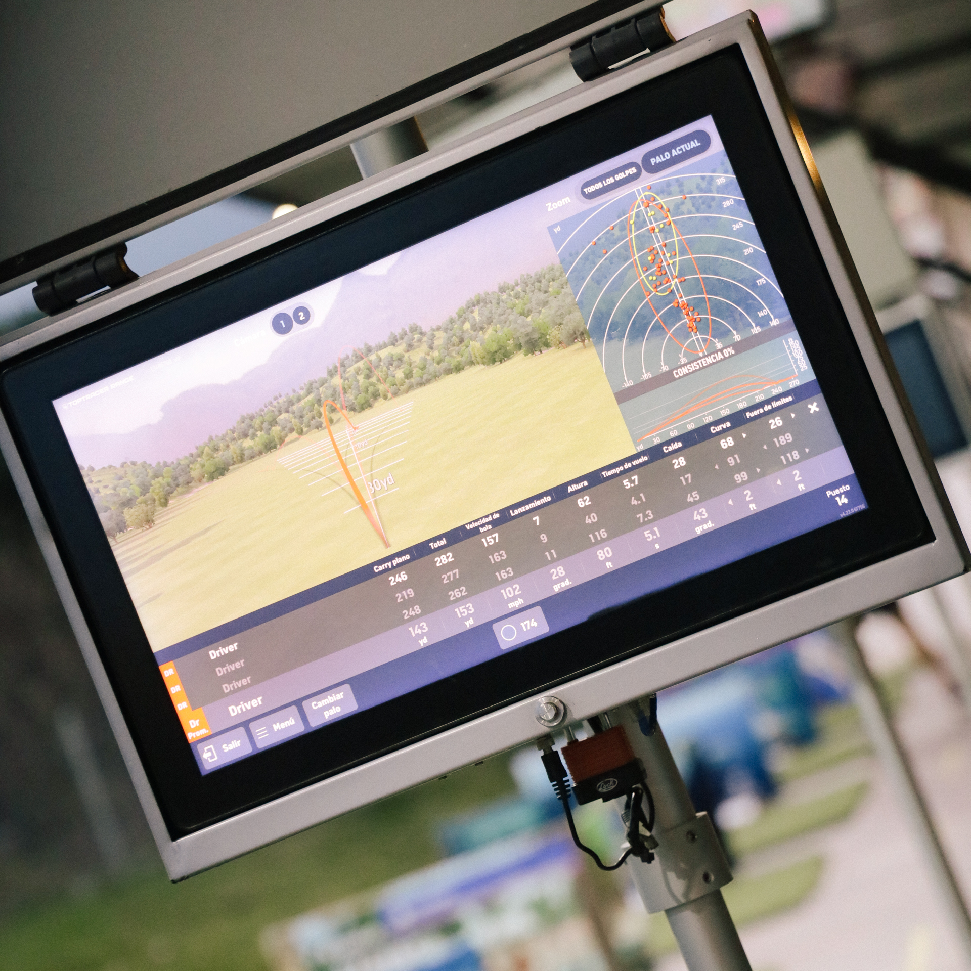 A través de cámaras de alta precisión, Toptracer rastrea la trayectoria de la bola en tiempo real, mostrando distancia, velocidad, altura y recorrido en pantalla después de cada golpe.